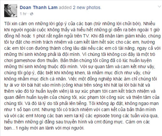 Thanh Lam chia sẻ trên trang cá nhân: "Tôi xin cám ơn những lời góp ý của các bạn (trừ những lời chửi bới). Nhiều khi, người ngoài cuộc không thấy và hiểu hết những gì diễn ra bên ngoài 1 giờ đồng hồ hoặc 1 phút rất ngắn ngủi trên TV. Khi nhận làm giám khảo, chúng tôi tự đặt cho mình trách nhiệm và cam kết làm hết sức cho các em, hướng các em tới con đường thành công lâu dài nếu các em có tài năng, ngay cả với những thí sinh không phải là đội mình... Với sự quan tâm và cam kết như vậy, chúng tôi góp ý, đặc biệt khi không khen, là nhằm mục đích như vậy, chứ không nhằm mục đích cá nhân".