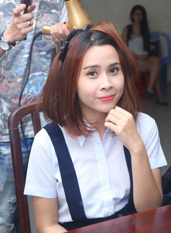 Lưu Hương Giang trang điểm trẻ trung và nhí nhảnh để phù hợp với trang phục học sinh. Cô chọn son màu cam, tạo lớp nền nhẹ nhàng, tự nhiên và gần như không tán phấn mắt.