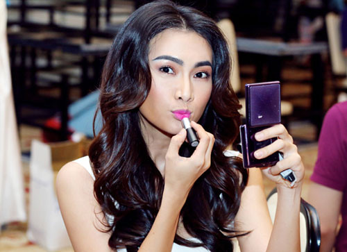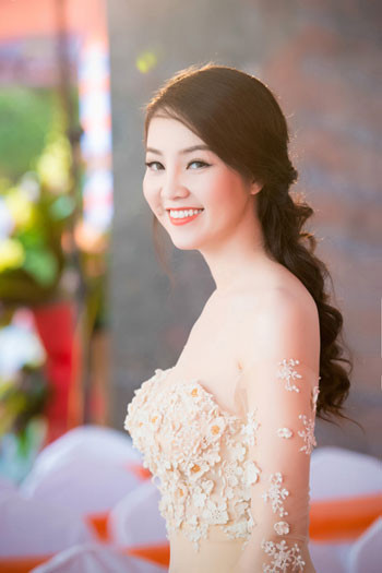 Người mẫu Hoàng Thùy cũng trang điểm với tông tím hồng chủ đạo, hài hòa cùng chiếc váy, tôn làn da khỏe khoắn.