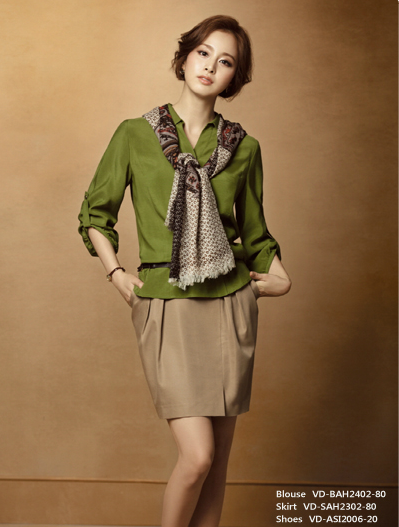 Tone màu chủ đạo của BST là màu nâu tối và màu trung tính nhưng vẫn toát lên một phong cách cực kì sang trọng. Chuyên gia trang điểm và stylist cố tình cho nữ viên trông thật đơn giản, ít phụ kiện và trang điểm nhẹ nhàng để làm nổi bật vẻ đẹp tự nhiên của cô.