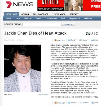 Trước đó vào năm 2013, Thành Long từng bị đồn qua đời. Đến giữa năm 2015, tin tức ngôi sao Kung Fu đột tử vì đau tim lại xuất hiện trên báo Anh.