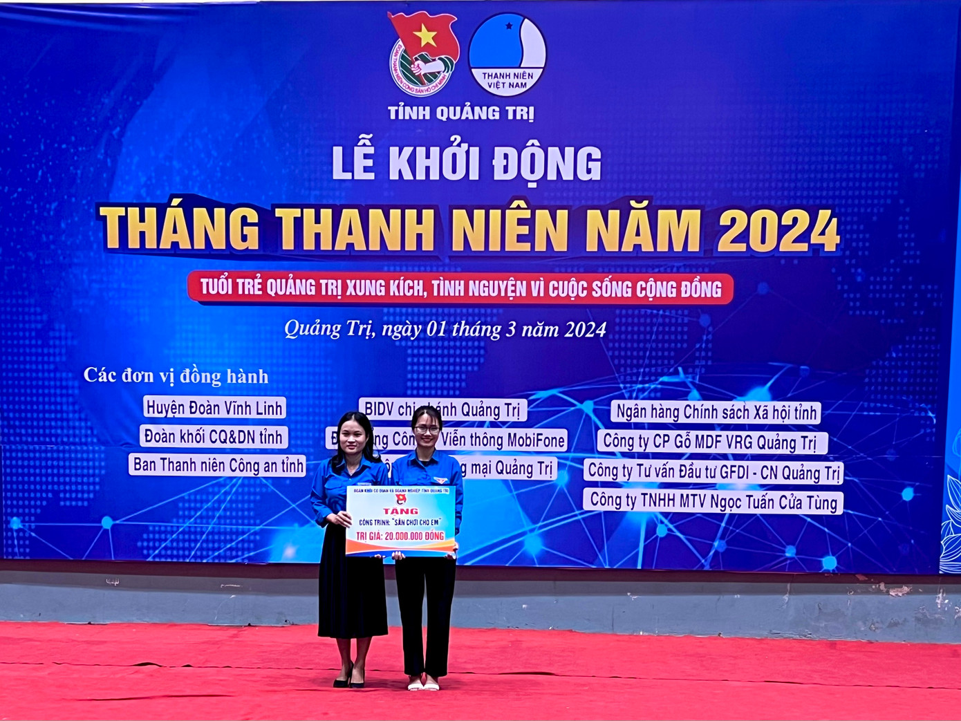Tại Lễ khởi động, Ban Thường vụ Tỉnh Đoàn, Ban Thư ký Hội LHTN Việt Nam tỉnh Quảng Trị phối hợp Ngân hàng Chính sách xã hội tỉnh Quảng Trị trao biển tượng trưng cam kết hỗ trợ vốn vay khởi nghiệp, lập nghiệp cho thanh niên Quảng Trị với tổng kinh phí 60 tỷ đồng cho 9 huyện, thị, thành Đoàn hỗ trợ các mô hình thanh niên phát triển kinh tế; phối hợp Công ty TNHH MTV Ngọc Tuấn Cửa Tùng trao tặng 20 suất quà, mỗi suất trị giá 500.000 đồng cho các em học sinh có hoàn cảnh khó khăn; phối hợp Đoàn thanh niên Tổng công ty Viễn thông Mobiphone trao tặng công trình vẽ tranh bích hoạ tại Trường Tiểu học Kim Đồng; phối hợp Công ty Cổ phần Gỗ MDF VRG Quảng Trị trao tặng 1 km công trình “Ánh sáng đường quê” cho xã Vĩnh Hà; trao tặng 1.000 ống sủi BEROCCA MANGO cho Huyện Đoàn-Câu lạc bộ Thầy thuốc trẻ huyện Vĩnh Linh; Đoàn Khối cơ quan và Doanh nghiệp tỉnh Quảng Trị trao tặng 1 công trình “Sân chơi cho em” cho thiếu nhi tại làng Huỳnh Thượng, xã Vĩnh Sơn trị giá 20 triệu đồng; Ban Thanh niên Công an tỉnh Quảng Trị phối hợp huyện Đoàn Vĩnh Linh trao tặng 2 km công trình “Ánh sáng đường quê” cho xã Vĩnh Ô, huyện Vĩnh Linh.