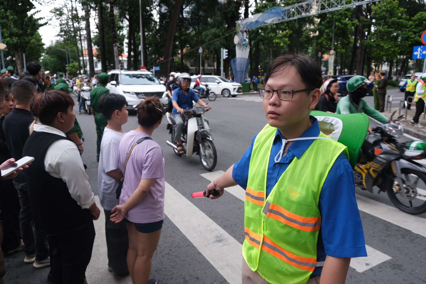 Bạn Nguyễn Trần Tiến (sinh viên trường Đại học Khoa học & Xã hội Nhân văn, Đại học Quốc gia TP.HCM) chia sẻ: "Chúng mình tham gia vào khâu chuẩn bị nhu yếu phẩm như bánh, nước để phục vụ người dân đến viếng. Bên cạnh đó là phối hợp với các tình nguyện viên khác để xử lý khi có vấn đề xảy ra."