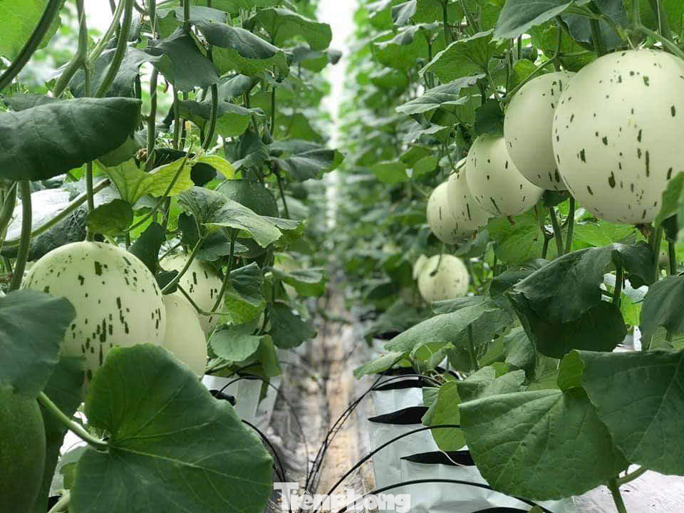| Dưa được trồng trong nhà màng, được tự động hóa theo công nghệ hiện đại với quạt mát, phun sương tưới ẩm. |
