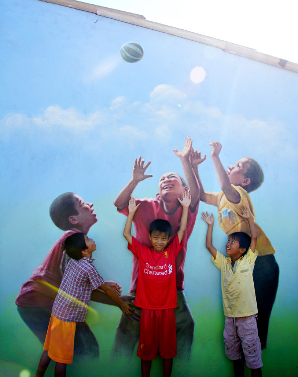 Chủ nhân ngôi nhà xúc động trước bức ảnh vẽ tất cả thành viên trong gia đình bên tường nhà. Người đàn ông làm nghề thợ may cùng vợ và hai con nhỏ được phác họa trong bức tranh. Các tình nguyện viên Hàn Quốc cho hay do thời tiết Việt Nam những ngày này quá nóng nên rất khó khăn trong việc sáng tác.