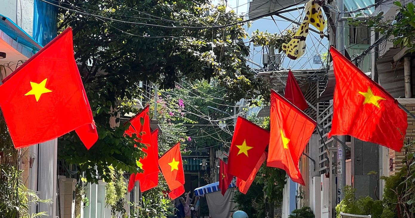 | Mấy ngày nay, tại hẻm Nguyễn Tri Phương (quận Hải Châu) cờ đỏ sao vàng tung bay |