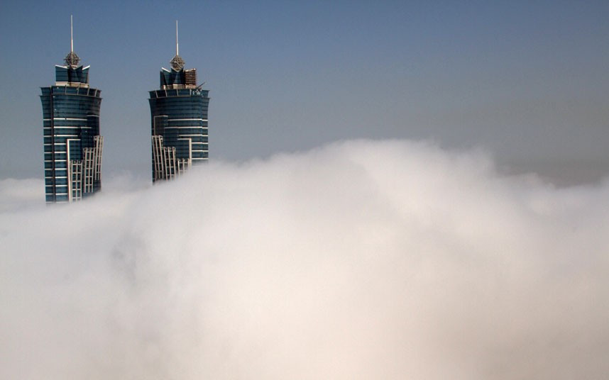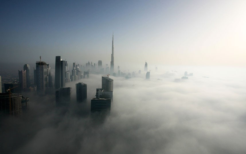 Tòa nhà cao nhất thế giới Burj Khalifa, cao 828m vượt lên khỏi tầng sương mù, ánh đèn của các cửa hàng, khu dân cư khắp sáng tầng mây từ dưới lên tạo nên tầng mây bảy sắc cầu vồng.