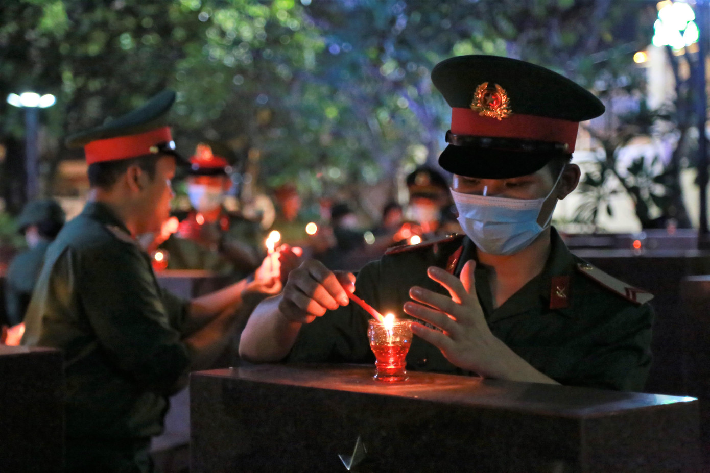 | Các chiến sĩ trẻ thành kính dâng lên anh linh các liệt sĩ những nén hương, ngọn nến với lòng biết ơn sâu sắc. |