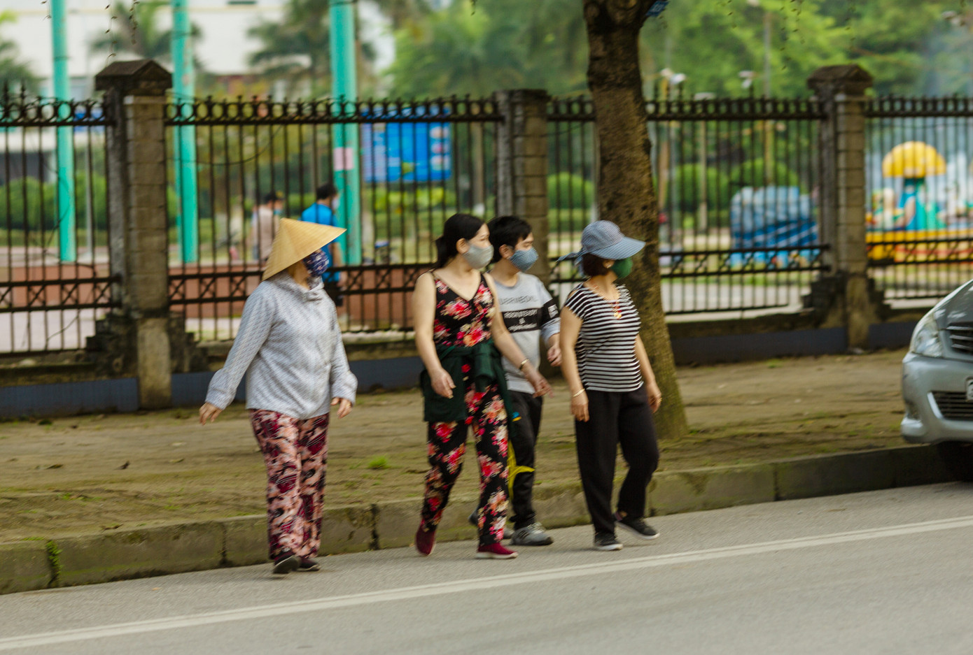 Một số người dân đi bộ thể dục băng qua đường Hồ Tùng Mậu.