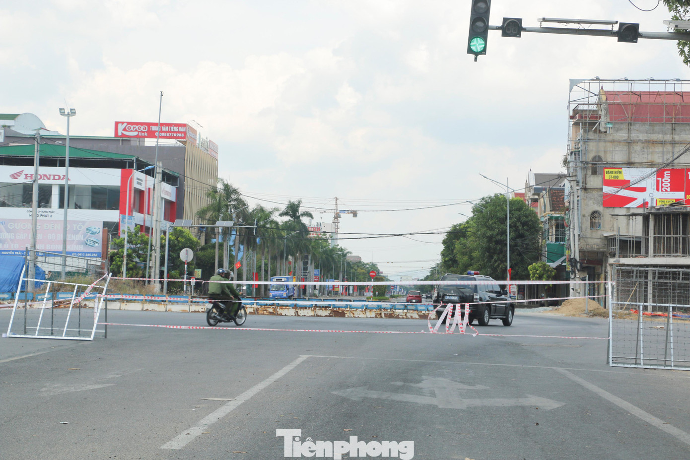 Hơn 100 chốt kiểm soát được thiết lập ở thành phố Vinh để kiếm soát người ra đường, đảm bảo việc giãn cách xã hội được tiến hành nghiêm túc, hiệu quả. Trong ảnh: Thượng úy Nguyễn Duy Phú (Phòng PA03) đang lập hàng rào chắn tại chốt Chợ Vinh.
