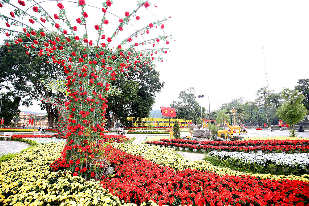 Những thảm hoa tươi được trang trí dựa trên ý tưởng ngọn núi biểu tượng dãy núi Hoàng Liên Sơn và hoa văn thổ cẩm tượng trưng văn hóa các dân tộc vùng Tây Bắc hướng về Đại hội.