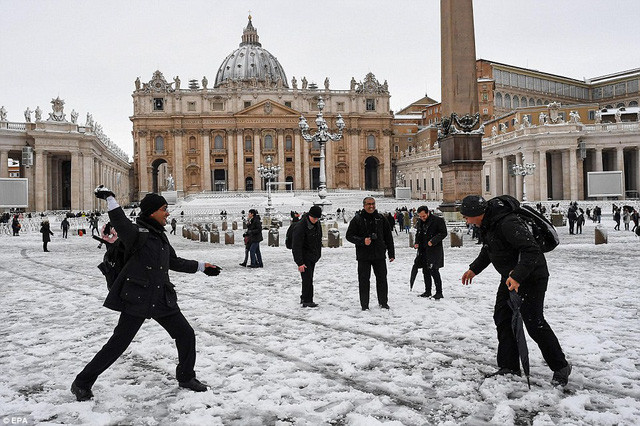 Bất chấp lời cảnh báo từ chính quyền địa phương khuyên nên ở nhà nếu có thể, một số người vẫn đổ ra đường tận hưởng đợt tuyết dày kỷ lục trong suốt 6 năm qua. Người ta cũng thấy cảnh du khách và người dân thi trò ném tuyết bên ngoài Vatican.