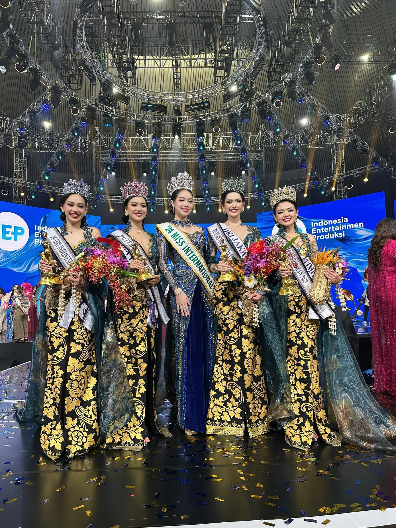 Trên sân khấu đêm chung kết, Thanh Thủy hội ngộ đương kim Hoa hậu Siêu quốc gia Harashta Haifa Zahra, đương kim Miss Cosmo - Ketut Permata Juliastrid và đương kim Miss Charm - Rashmita Rasindran. 4 hoa hậu quốc tế khoe nhan sắc lộng lẫy trong thiết kế truyền thống của Indonesia.