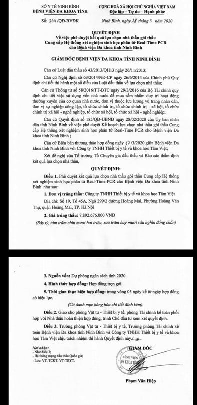 Được biết, trong các gói thầu bị thanh tra đột xuất lần này có gói thầu mua máy xét nghiệm trị giá trên 5,9 tỷ đồng mà Báo Tiền Phong đã phản ánh trong bài viết "Bỏ nhiều tỷ đồng mua máy xét nghiệm COVID-19, đơn vị mua không biết giá thực" (đăng ngày 30/4). Trong bài viết này, ông Phạm Văn Hiệp, Giám đốc Bệnh viện đa khoa tỉnh Ninh Bình xác nhận đơn vị này đã mua và lắp đặt hệ thống máy xét nghiệm COVID- 19 của Công ty TNHH thiết bị y tế và khoa học Tâm Việt (có địa chỉ tại số 19, tổ 45A, ngõ 299/2 đường Hoàng Mai, phường Hoàng Văn Thụ, quận Hoàng Mai, thành phố Hà Nội) với tổng giá trị hợp đồng là 7,892,676 tỷ đồng.