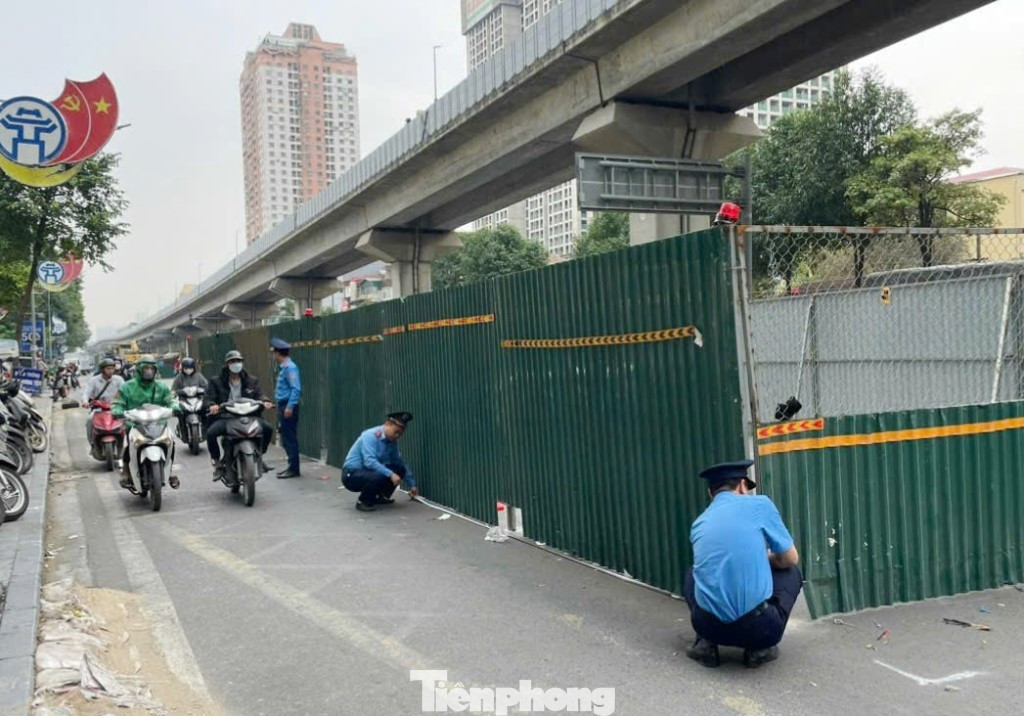 | TTGT Sở GTVT Hà Nội xác định: Trên phố Vũ Trọng Khánh, tại các thời điểm kiểm tra hàng rào để không lâu ngày và không có dấu hiệu được thi công; công trường không có người đứng cảnh báo, điều tiết giao thông. Đại diện tổ công tác liên lạc qua điện thoại mời đơn vị thi công, nhà thầu ra làm việc nhưng không ai xuất hiện. |