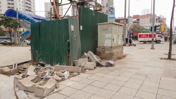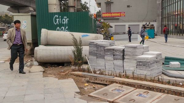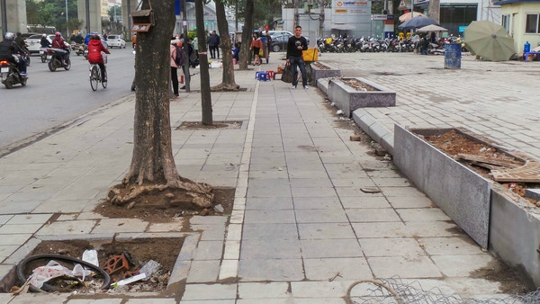 Công trình xây dựng TC2 của dự án Xây dựng đường nối khu đô thị Nam Trung Yên với đường Vành Đai 2.5, quận Cầu Giấy..., cũng gây bong tróc đá lát vỉa hè.