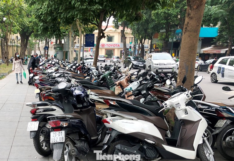Tại bãi trông giữ xe máy trên vỉa hè phố Hai Bà Trưng đoạn qua vườn hoa 19/8, tổ công tác của Thanh tra Sở GTVT Hà Nội đã phát hiện nhiều xe máy để ở ngoài vị trí được cấp phép (trông xe quá diện tích), xe để rất lộn xộn.