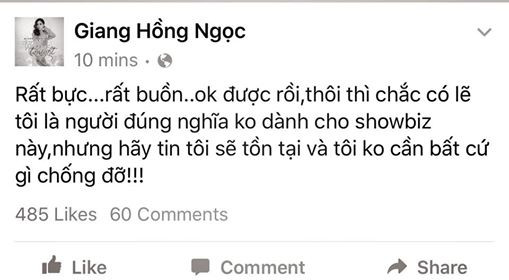 Ngay sau đó, Giang Hồng Ngọc đã có những chia sẻ đầy ẩn ý trên trang facebook cá nhân của mình. Cô viết: “Rất bực, rất buồn, ok được rồi, thôi thì chắc có lẽ tôi là người đúng nghĩa không dành cho showbiz này. Những hãy tin tôi sẽ tồn tại và không cần bất cứ gì chống đỡ”.