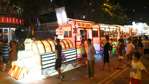 Một chiếc tàu hỏa dài hơn 20 mét được nối thành 4 toa kéo trên đường. Các bạn nhỏ được ngồi trên từng toa diễu hành trên phố