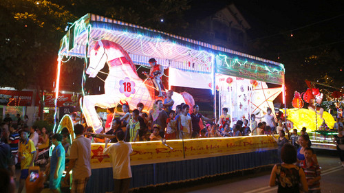 Ánh sáng từ những mô hình giao thoa với đèn điện trang hoàng trên phố tạo nên sắc màu lung linh rạng rỡ.