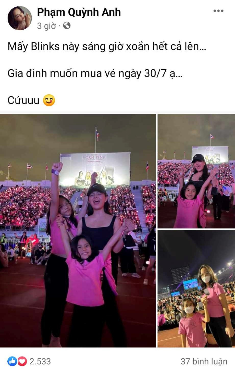 Phạm Quỳnh Anh cũng đăng tải loạt ảnh tham gia concert BLACKPINK tại Thái Lan cách đây không lâu cùng dòng trạng thái “kêu cứu” cộng đồng mạng cách mua vé concert. Theo hình ảnh được chia sẻ, có thể thấy hai cô con gái của Phạm Quỳnh Anh đều là những BLINK chính hiệu.