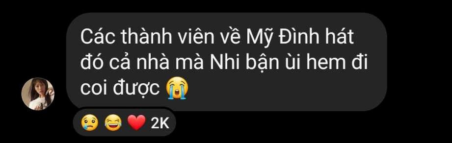Nổi tiếng là thành viên thứ 5 (tự phong) của BLACKPINK, nhưng có lẽ Diệu Nhi lại không thể tham dự concert lần này cùng hội chị em. Nữ diễn viên tiếc nuối chia sẻ trong nhóm chat với fan: “Các thành viên về Mỹ Đình hát đó cả nhà ơi mà Nhi bận rồi không đi coi được”.