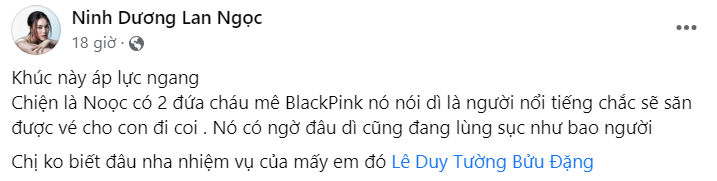 Là một diễn viên nổi tiếng, nhưng có vẻ như việc cạnh tranh để có tấm vé tham dự concert của BLACKPINK lúc này cũng không hề đơn giản với Ninh Dương Lan Ngọc. Nữ diễn viên chia sẻ cảm thấy “áp lực” khi được những người cháu của mình “giao nhiệm vụ” săn vé concert sắp tới.