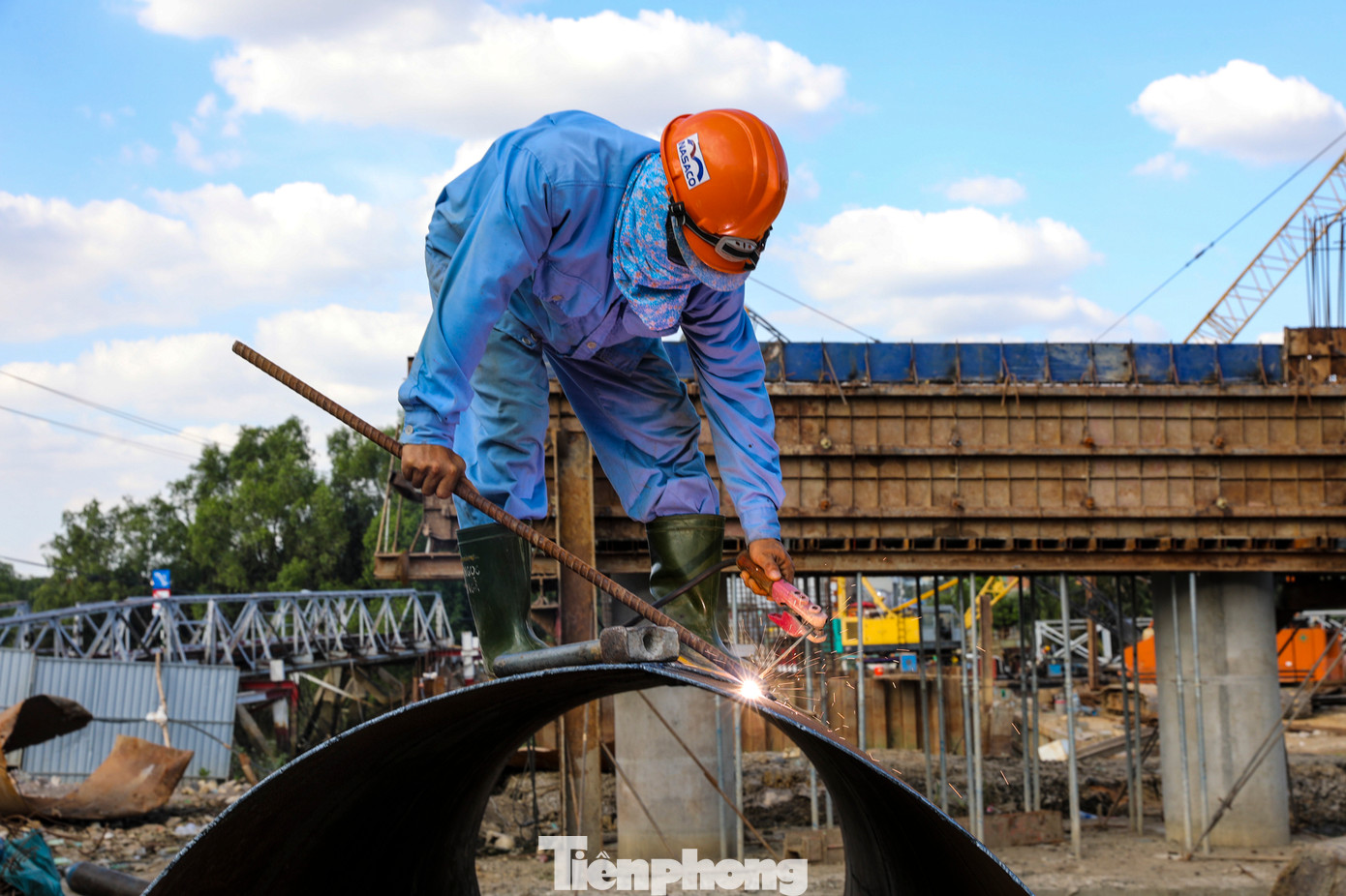 | Hàng chục công nhân cùng nhiều máy móc cũng đang gấp rút xây dựng những phần đầu tiên của cây cầu mới. |