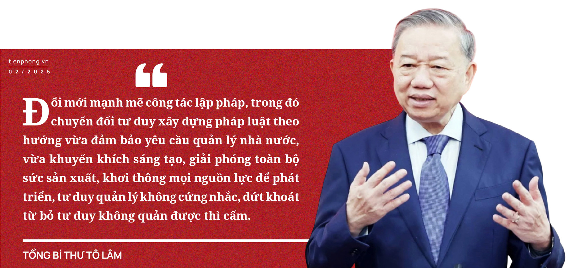 Từ thực tiễn trên, Tổng Bí thư nhấn mạnh yêu cầu đổi mới mạnh mẽ công tác lập pháp và dứt khoát từ bỏ tư duy “không quản được thì cấm”. Các quy định của pháp luật phải mang tính ổn định, lâu dài, luật chỉ quy định những vấn đề khung, cũng không cần quá dài. Những vấn đề thực tiễn biến động thường xuyên thì giao Chính phủ, địa phương quy định để bảo đảm linh hoạt trong điều hành. Đồng thời, cần đẩy mạnh phân cấp, phân quyền với phương châm “địa phương quyết, địa phương làm, địa phương chịu trách nhiệm”.