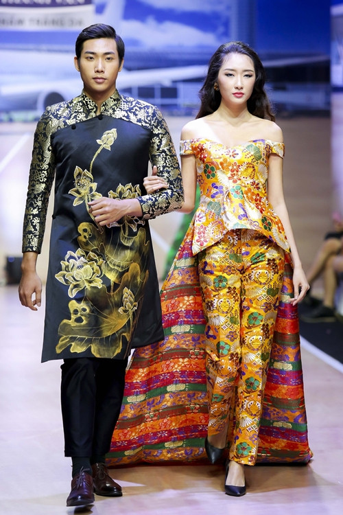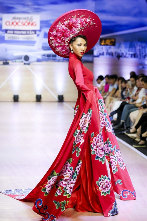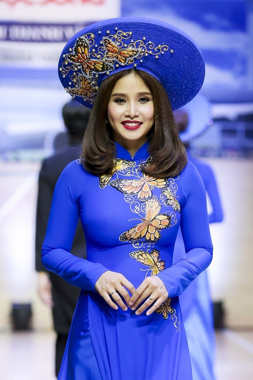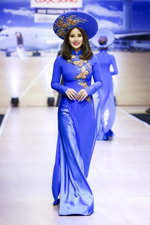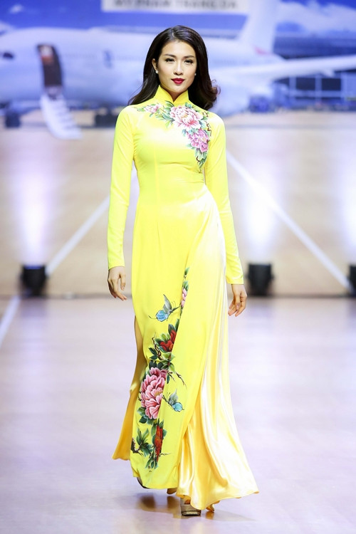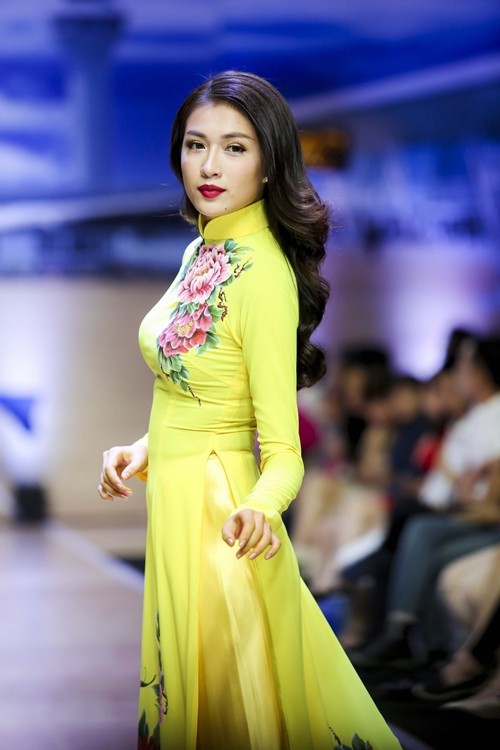 Á hậu Lệ Hằng catwalk với áo dài vàng chóe.