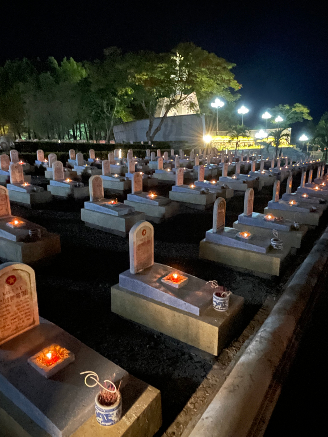 | Thắp nến và dâng hương tại nhà bia tưởng niệm và các phần mộ liệt sỹ đang an nghỉ tại Nghĩa trang liệt sỹ Quốc gia Đường 9 tối 26/7. |