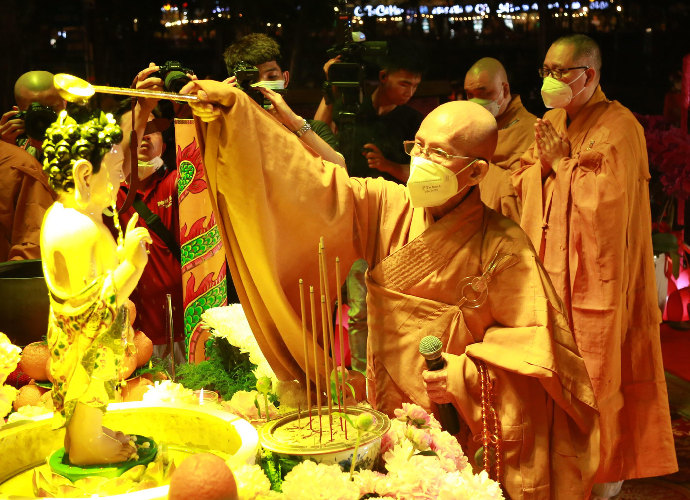 | Chư tăng hành lễ chuẩn bị nghi thức thắp sáng 7 đóa sen trên dòng kênh Nhiêu Lộc, đoạn qua Quan Âm tu viện. |