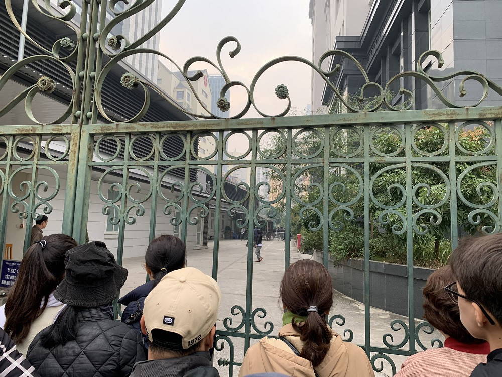 Rất đông người nhà các bị cáo đã có mặt nhưng không được phép vào trong. Họ đứng bên ngoài tòa án, cố nhìn người thân của mình đang bị dẫn giải.