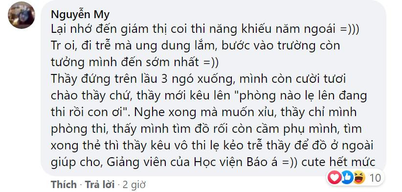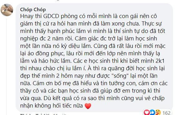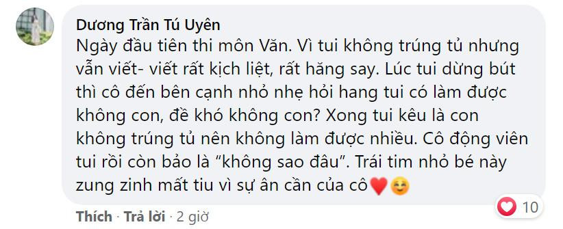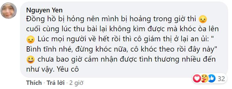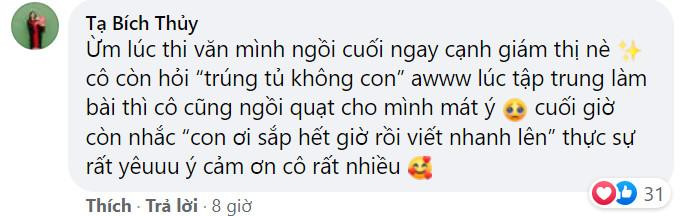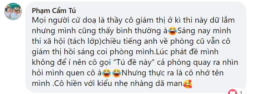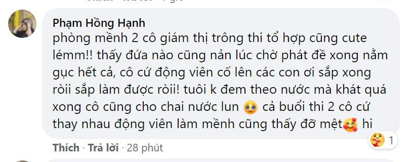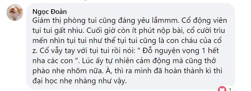 Còn tài khoản Hà Minh Anh chia sẻ: "Hồi tôi đi thi văn ngồi bàn một cũng được giám thị quạt bằng tay cho luôn, xong còn chỉnh quạt chỗ cô về phía mình và hỏi mát chưa. Hôm thi tổ hợp có bạn đến nhưng quên giấy dự thi, cô giám thị động viên bạn ấy bình tĩnh. Nói chung ấm lòng".