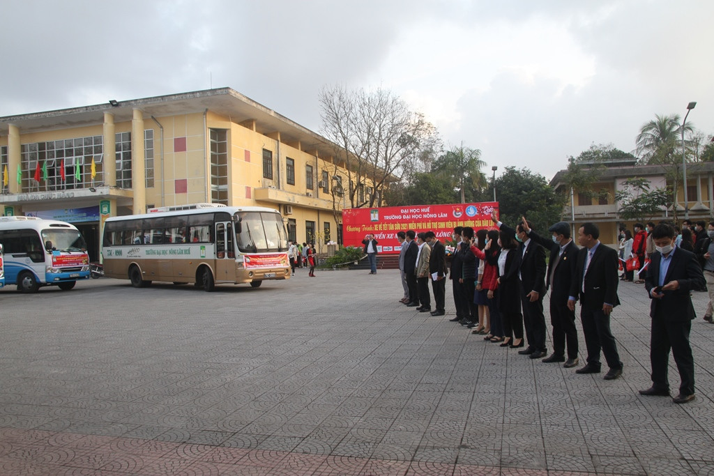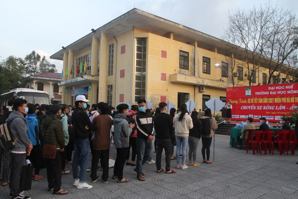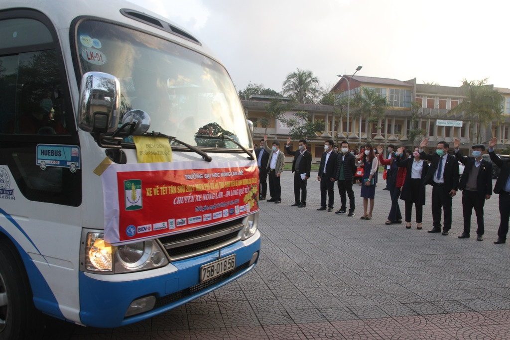Năm nay, Trường Đại học Nông lâm (Đại học Huế) tổ chức 6 chuyến xe đưa sinh viên về quê đón Tết tại các tỉnh miền Trung như Nghệ An, Hà Tĩnh, Quảng Bình, Quảng Trị, Quảng Nam, Quảng Ngãi, Bình Định và khu vực Tây Nguyên.