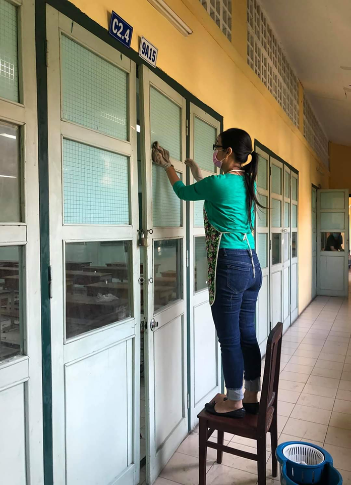 Các thầy cô trường THPT chuyên Trần Đại Nghĩa, TP.HCM lau dọn phòng học.