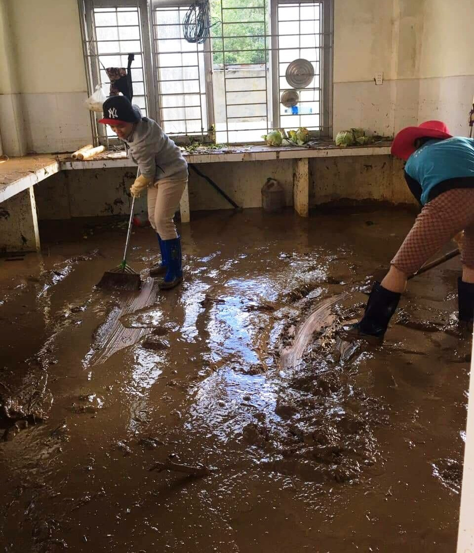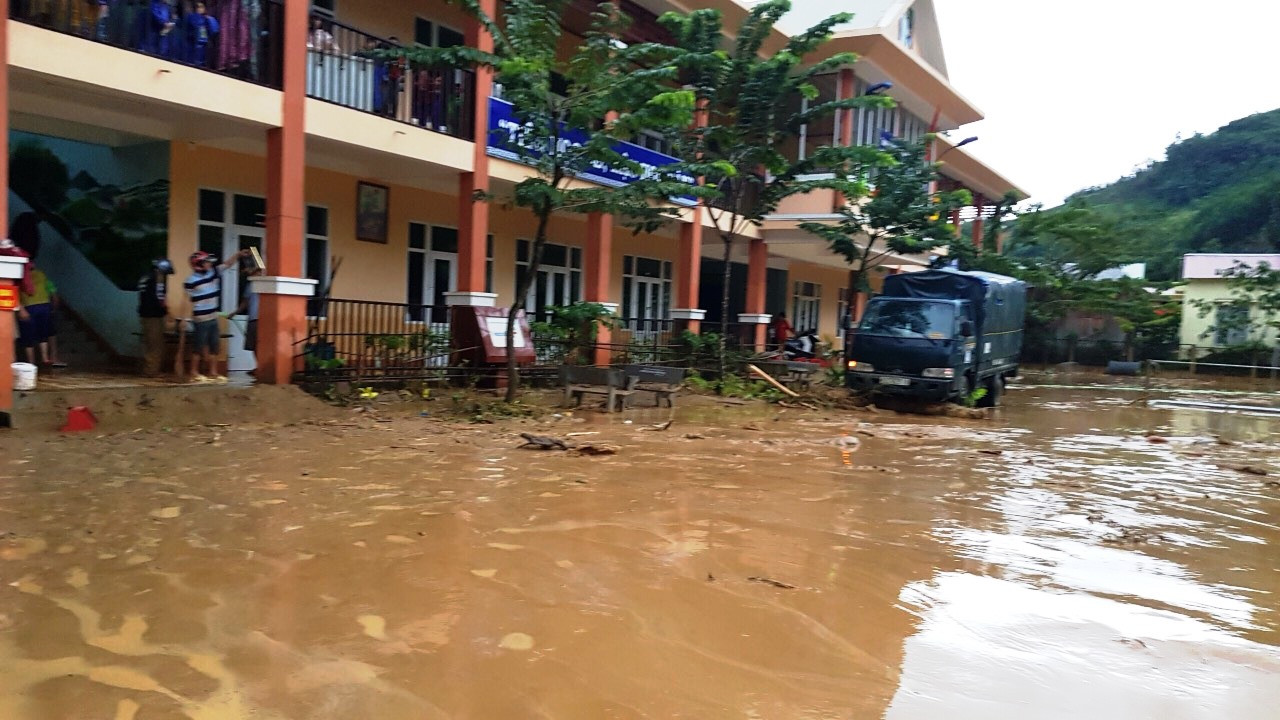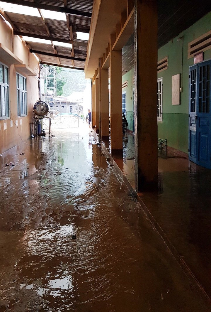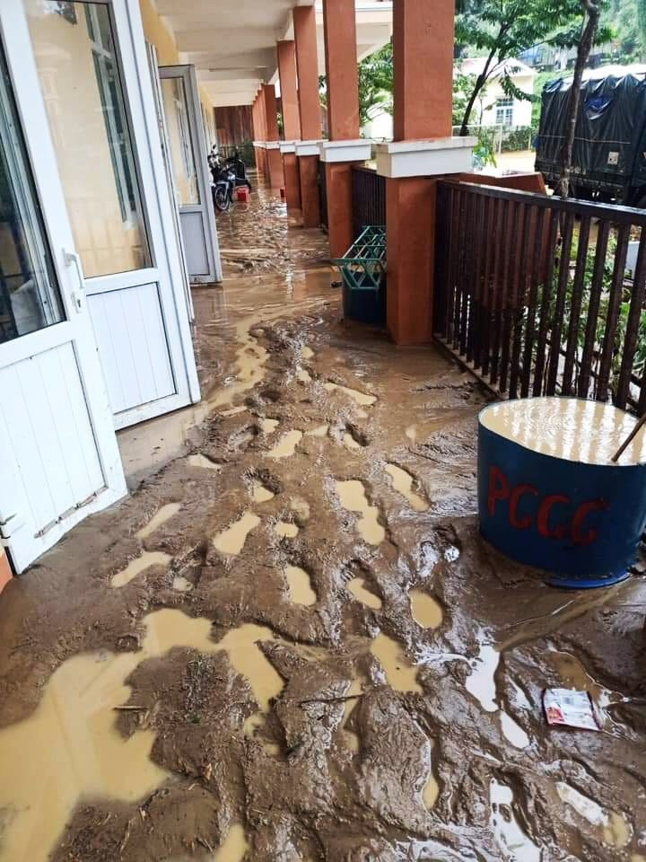 Những khối bùn đất tràn vào sân trường, lớp học và nơi ở. Bàn ghế dụng cụ mọi thứ ngổn ngang sau lũ.