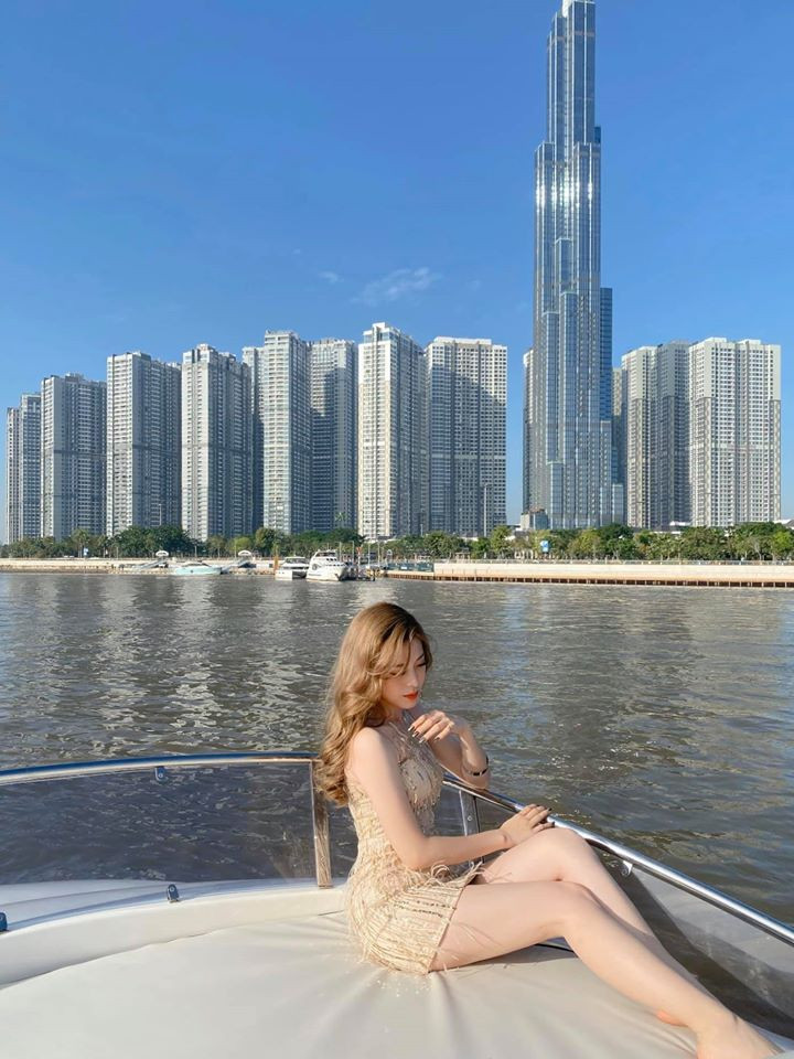 Á hậu Phương Nga khoe dáng xinh đẹp và quyến rũ trên sông Sài Gòn.
