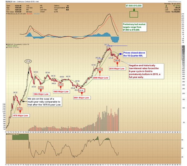 Theo dự báo, vàng sẽ có một hành trình tăng giá kéo dài cả thập kỷ tới, và giá có thể lên tới 7.500 USD/Ounce (khoảng 200 triệu đồng/lượng), thậm chí 10.000 USD/Ounce sau cú chạm đáy nhanh hơn dự đoán của giới đầu tư. Sau gần 1 thập kỷ tăng trước đó, vàng chỉ giảm giá trong 3 năm và đã chính thức tăng mạnh trở lại nửa đầu 2016. Chỉ tính riêng quý II/2016, vàng đã tăng 25%.