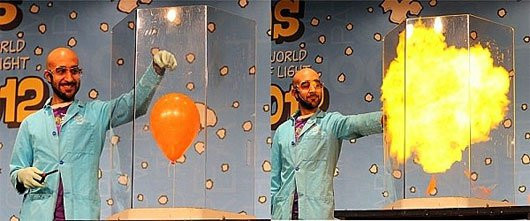 Khi có tác dụng của lửa, dù là nhỏ như bật lửa, tàn thuốc, bóng bay giãn nở quá mức, áp suất khí bên trong tăng làm nổ bóng bay. Khi bóng nổ, hydro có thể tác dụng với oxy sẽ gây nổ như miêu tả ở trên. Sức công phá khi một quả bóng phát nổ có thể không lớn, nhưng khi cả chùm cùng nổ một lúc, hậu quả sẽ thật khôn lường.