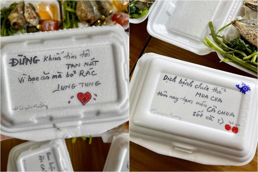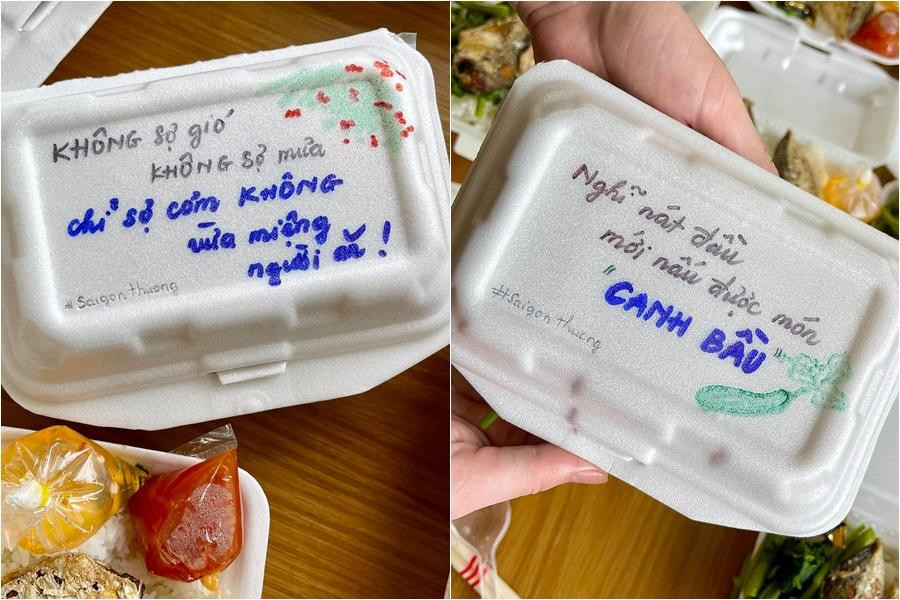 | Anh Lợi tự tay viết lời nhắn "cưng xỉu" trên những hộp cơm gửi vào Bệnh viện dã chiến số 7. |