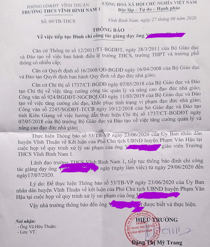 Ngày 29/6, bà Đặng Thị Mỹ Trang, Hiệu trưởng Trường THCS Vĩnh Bình Nam 1 (xã Vĩnh Bình Nam, huyện Vĩnh Thuận, tỉnh Kiên Giang), cho biết đã ra quyết định tạm đình chỉ công tác thêm 15 ngày đối với thầy giáo dạy Toán kiêm chủ nhiệm lớp 7/2 ở trường này là ông V.H.T (SN 1980) vì có dấu hiệu vi phạm đạo đức nhà giáo, để cơ quan chức năng vào cuộc điều tra làm rõ.