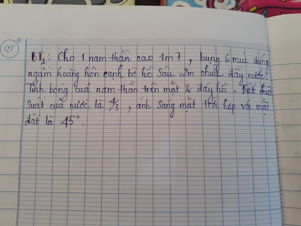 Nội dung đề bài như sau: “Cho một nam thần cao 1m7, bụng 6 múi đứng ngắm hoàng hôn cạnh bờ hồ sâu 2m chứa đầy nước. Tính bóng của nam thần trên mặt và đáy hồ. Biết chiết suất của nước là 4/3, ánh sáng Mặt Trời hợp với mặt đất là 45 độ".