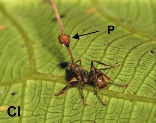 Một nghiên cứu gần đây tại rừng nhiệt đới Thái Lan cho thấy, một loại nấm ký sinh thuộc họ Ophiocordyceps đã xâm nhập vào đầu của kiến và điều khiển hành động của kiến. Những con kiến bị sai khiến đi lang thang trong trạng thái say xỉn, vượt qua tầng lá thấp và cắn lá ngấu nghiến bất cứ khi nào nấm ra lệnh.