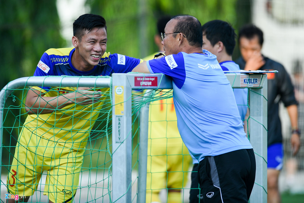Đội trưởng Quế Ngọc Hải tranh thủ tán gẫu cùng HLV Park Hang-seo trong khi các đồng đội tập luyện. Chiến lược gia người Hàn Quốc đứng gần khu vực luyện tập để tiện theo dõi các cầu thủ.