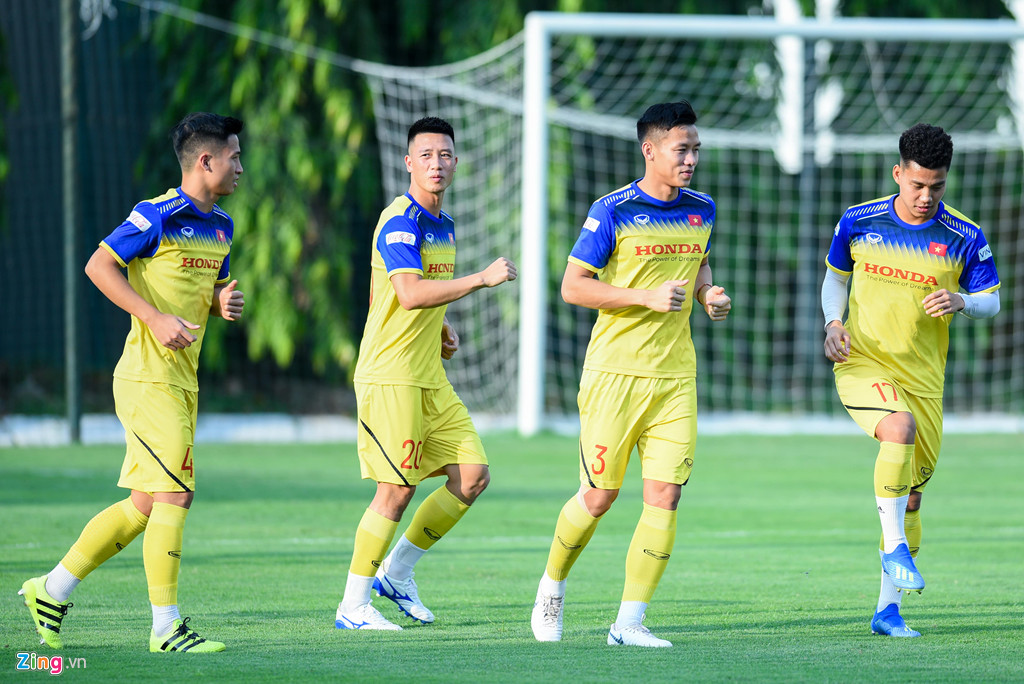 Ở phần sân còn lại, các cầu thủ tuyển Việt Nam chủ yếu tập những bài khởi động và di chuyển nhẹ nhàng. Bài tập này không đòi hỏi cao về tốc độ, mà yêu cầu khắt khe về sự chính xác.