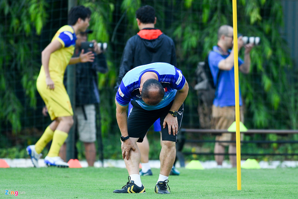 Gần cuối thời gian tác nghiệp của phóng viên, HLV Park Hang-seo di chuyển sang góc sân để kiểm tra bắp chân phải. Cách đây không lâu, ông dính chấn thương tại nhà riêng.