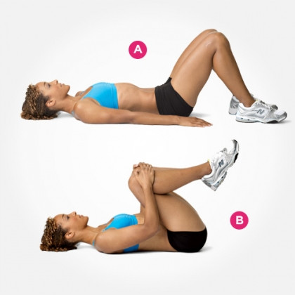 Động tác 5: Nằm ngửa, hai chân cong, hai tay duỗi theo thân.Nâng hai đầu gối, dùng tay kéo nhẹ nhàng về phía ngực, phần lưng vẫn nằm thẳng với mặt sàn khi thực hiện động tác. Giữ tư thế từ 2-3 giây và từ từ hạ thấp chân xuống. Lặp lại động tác 10 lần. Động tác này nhằm kích thích các dây thần kinh ở vùng lưng dưới của bạn trở nên nhạy cảm hơn.