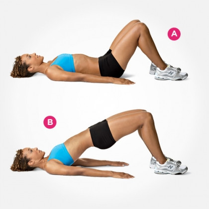 Động tác 4: Nằm trên sàn, hai tay duỗi thẳng dọc theo thân người, lòng bàn tay úp, hai chân hơi co lại. Nâng phần hông khỏi mặt sàn cho đến khi đầu gối, hông và vai tạo thành một đường thẳng. Lặp lại động tác 20 lần. Động tác này sẽ giúp cho khung xương chậu của bạn rắn chắc và khỏe mạnh hơn.