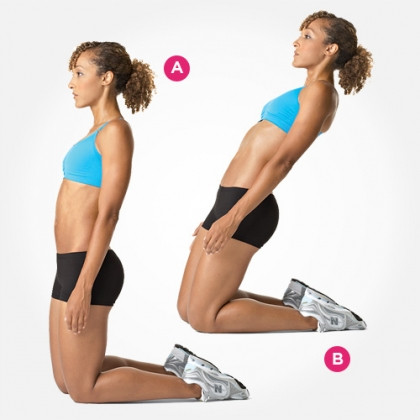 Động tác 3: Quỳ gối, hai tay áp dọc theo đùi. Lưng thẳng, đầu gối vuông góc với mặt sàn. Giữ đầu và cột sống thẳng, từ từ nghiêng người về phía sau, giữ nguyên tư thế trong 3 giây và trở về tư thế ban đầu. Lặp lại động tác từ 5-10 lần.